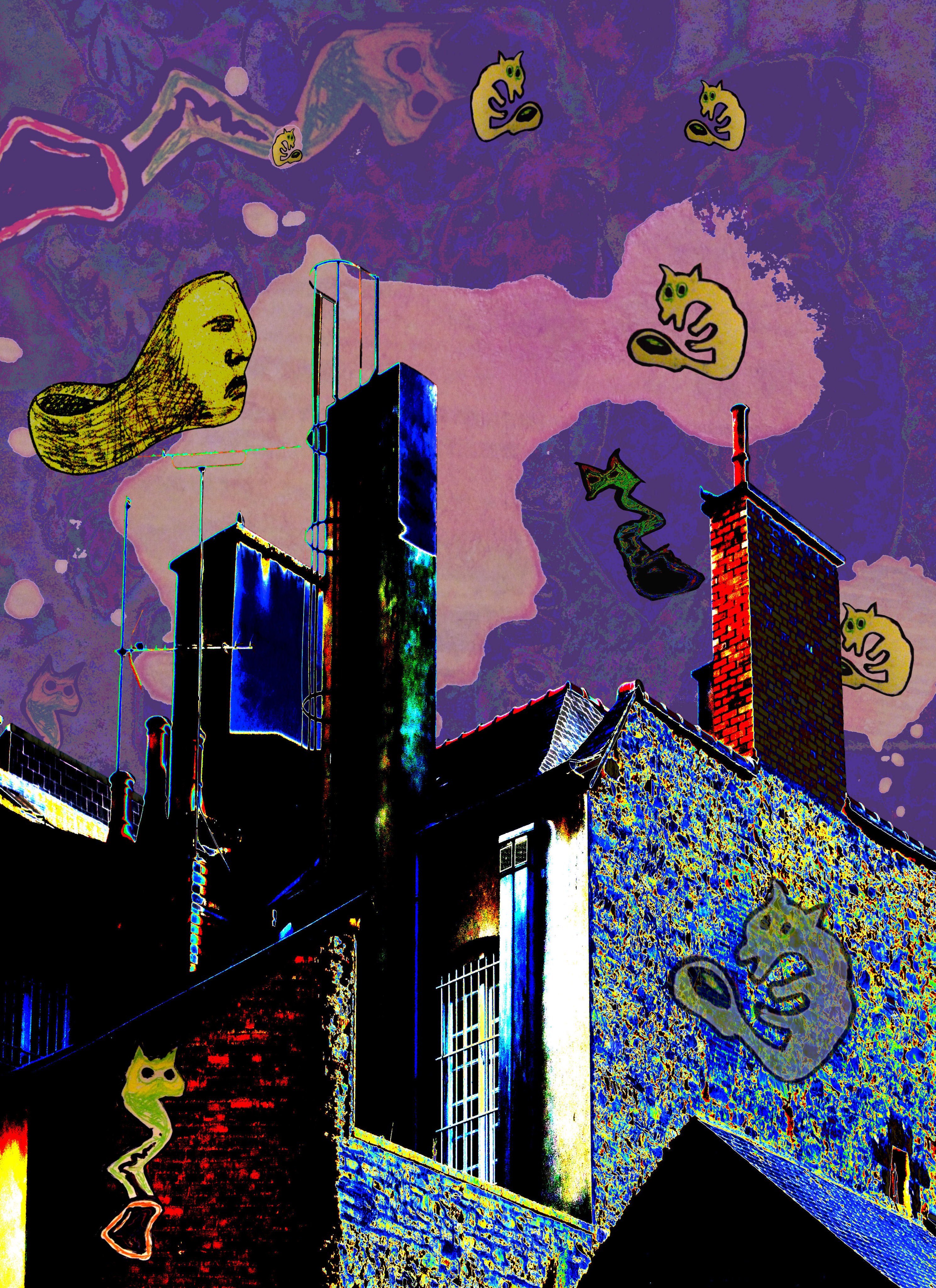 "Mondaynight roofscape in Rennes somewhere back in 2008 " " " is een digigrafiek, een digitale combinate van dakschappen in Rennes en fragmenten uit mijn tekeningen. Geprint op Hahnemülle Fine Art Paper (310 grams geschept papier). Beeld formaat standaard ongeveer 37x 50 cm maar andere formaten zijn mogelijk. Maximum oplage:10