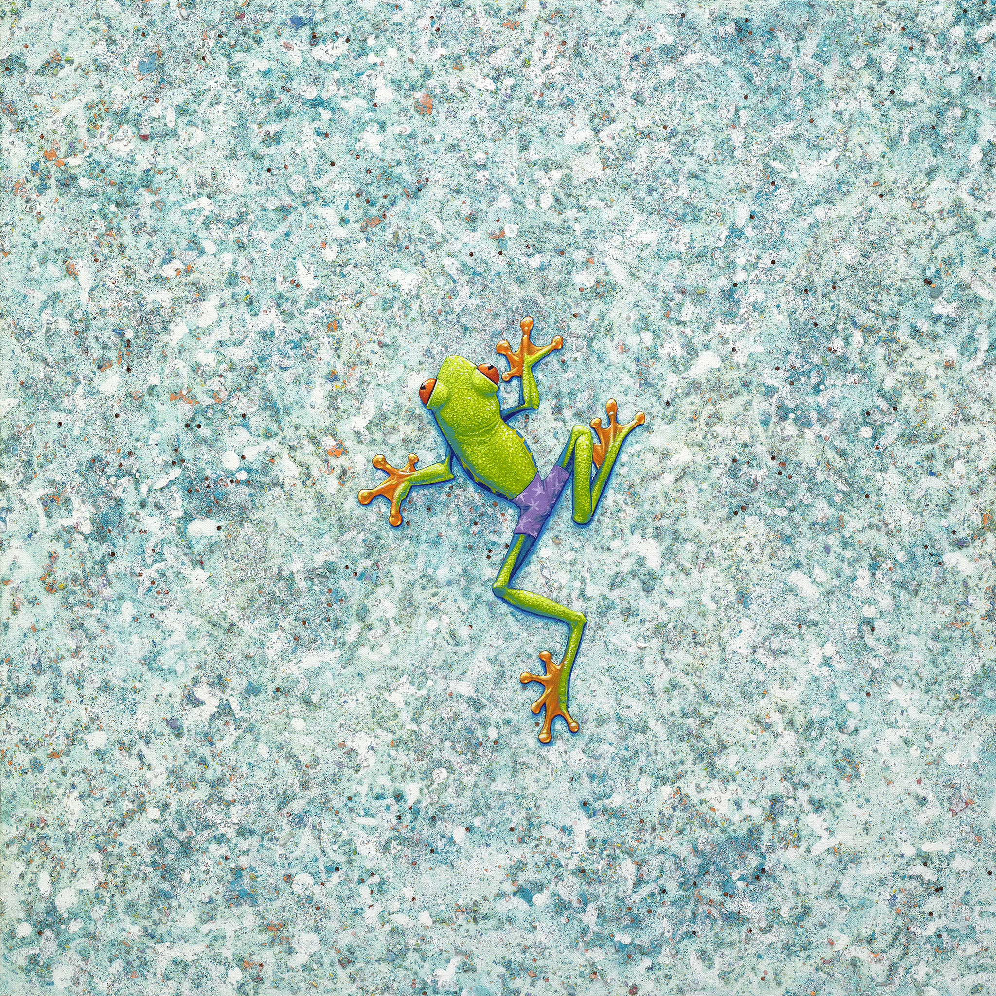 Schilderij met een kikker gezien vanaf de bovenkant. Acryl en glitters