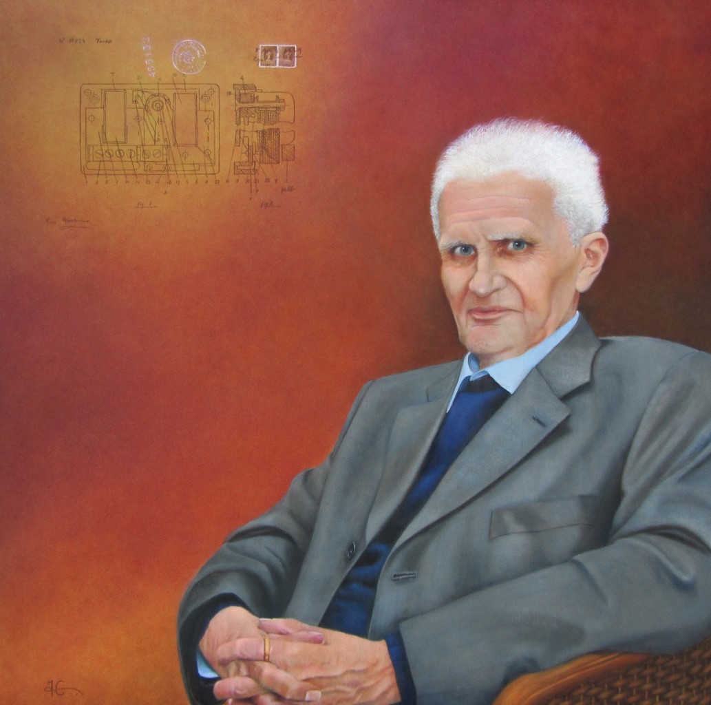 Opdracht Portret van een ondernemer, aan het eind van zijn loopbaan. Het relais in de hoek, zijn eerste uitvinding, is de start geworden van een groot, internationaal bedrijf.