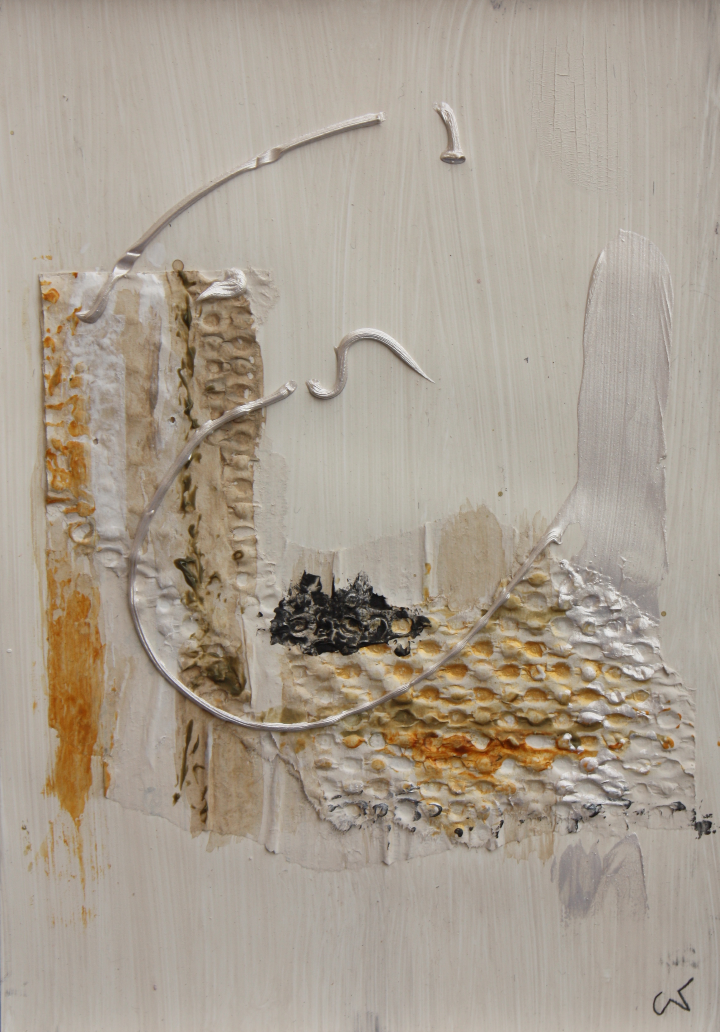 Het verstrijken van de tijd en het effect ervan -wat er overblijft- inspireert mij enorm. Welke invloed heeft tijd op materialen, bezit, de natuur. Maar ook; welke invloed heeft de tijd op herinneringen, je identiteit, je wezen. Herinneringen worden vaak getekend, of vertekend door de tijd. Materialen vertonen slijtage of gaan stuk. Bezit kan toe- of afnemen in waarde of zijn glans verliezen. De natuur kent een cyclus van pril begin naar onverbiddelijk eind – om vervolgens toch weer opnieuw te beginnen. Daarom gebruik ik allerlei materialen in mijn schilderijen. Alles is te gebruiken, alles heeft een verhaal. Het verstrijken van de tijd, de ” imperfectie” die daardoor ontstaat, is vele malen mooier dan de levenloze perfectie waar wij in de westerse wereld zoveel waarde aan hechten.