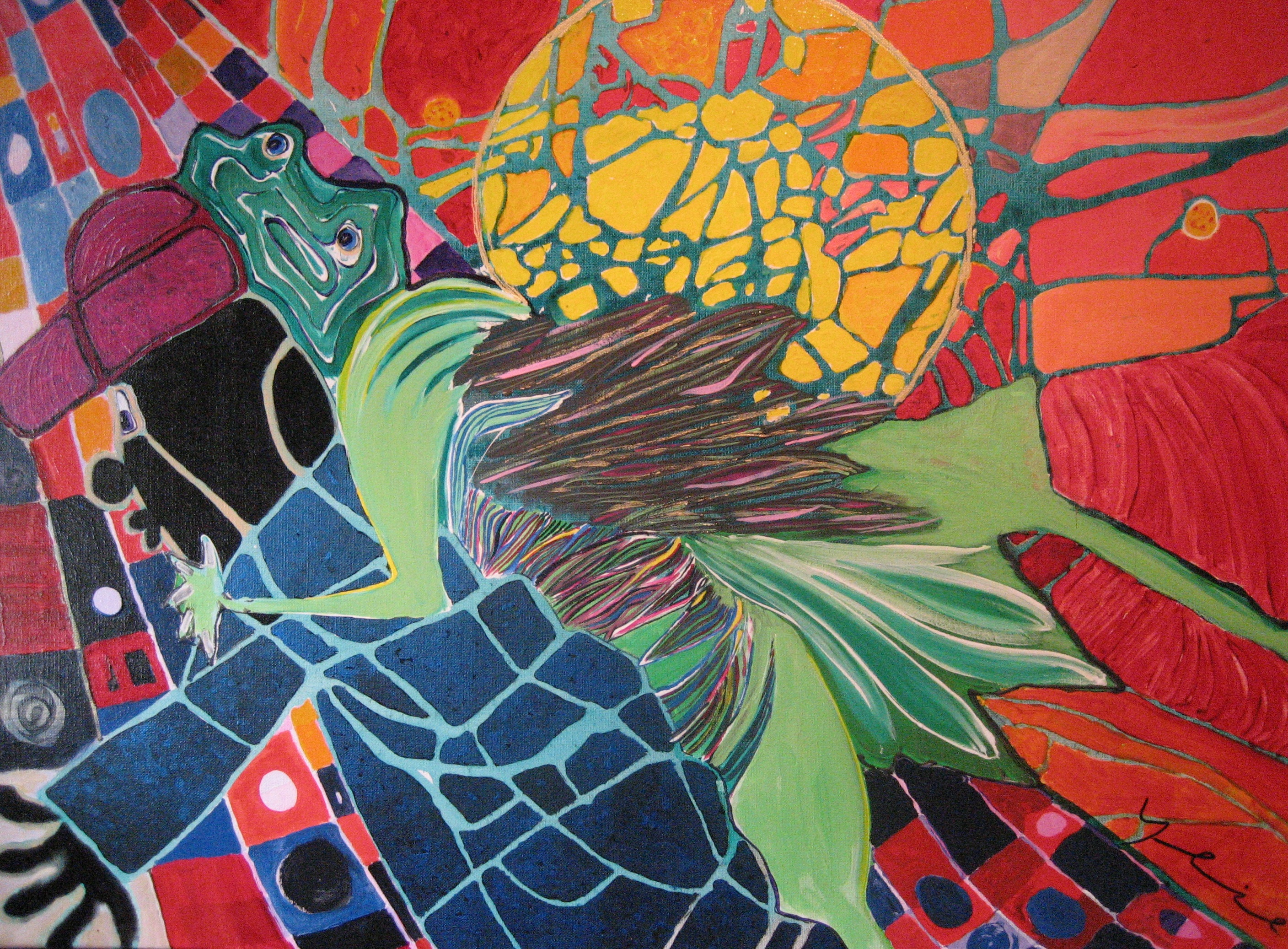lichtheid en humor spelen in dit werk een grote rol, een vliegende kikker die een angstige man vasthoudt