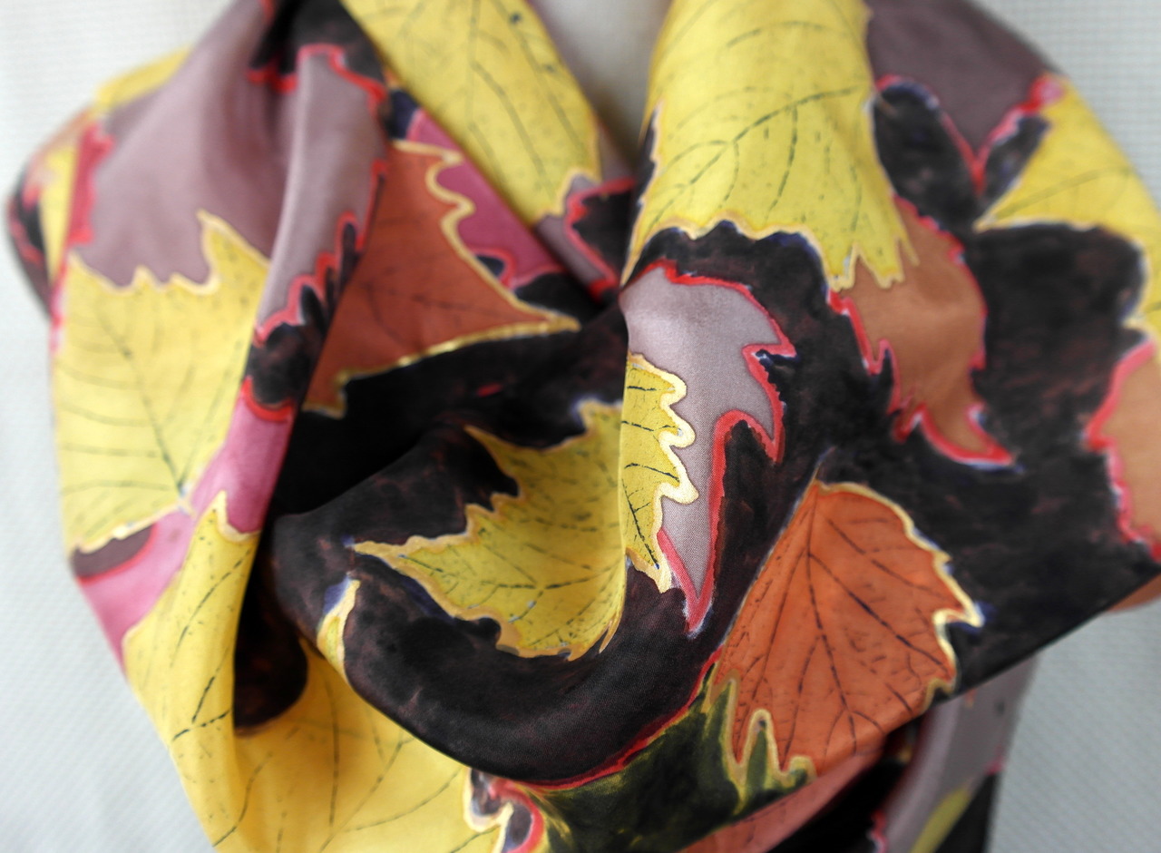 Handbeschilderde zijden shawl ,pongé 08, met bladmotief. De zijdeverf is gefixeerd dmv stoom, waardoor de sjaal soepel om de hals valt. Zijden damessjaal herfst. Handgemaakte shawl . | Etsy