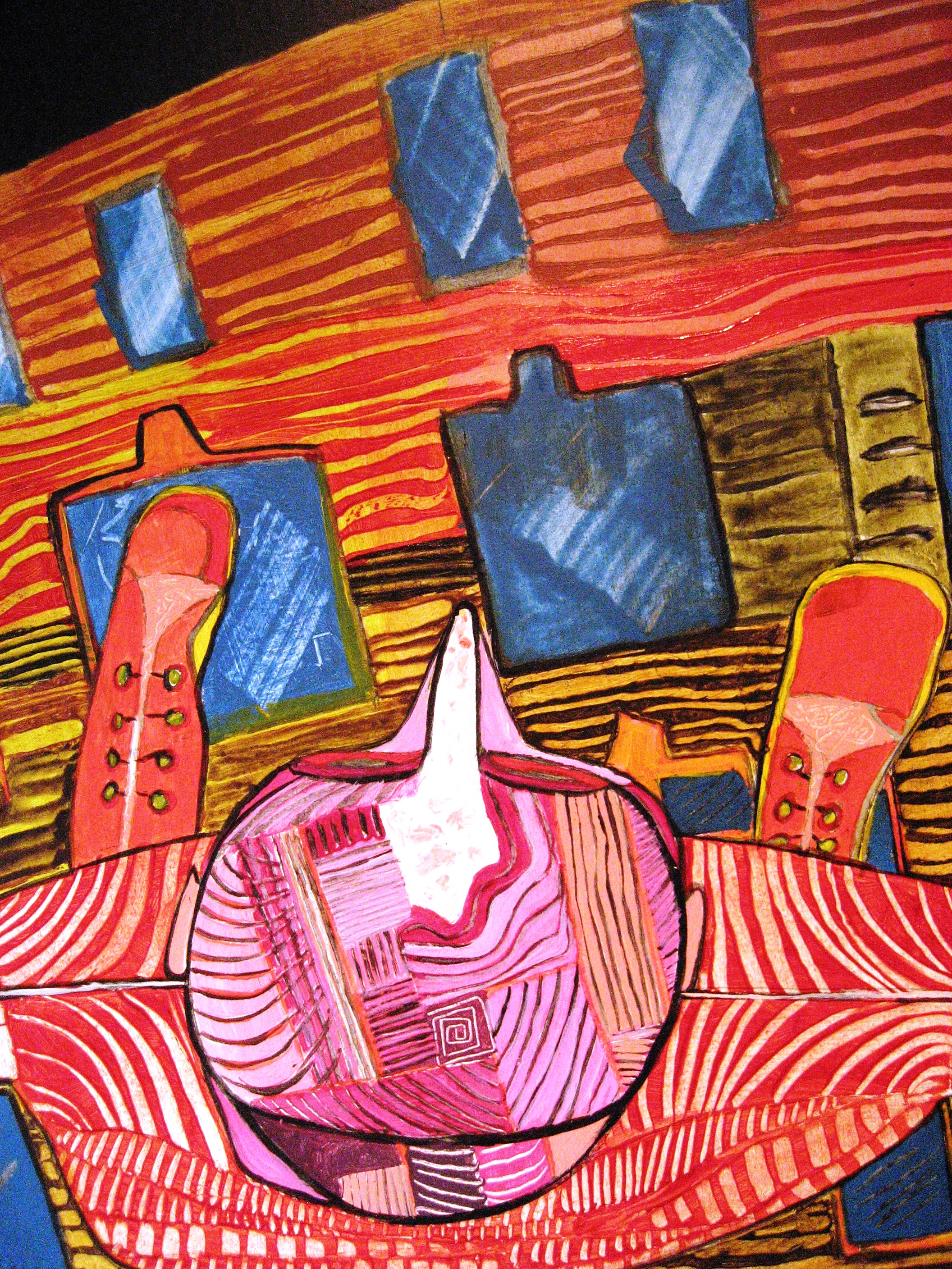 Van bovenaf gezien. Loopt de figuur tegen een gevel op? Loopt hij naar voren of naar achteren? Of allebei? (detail)