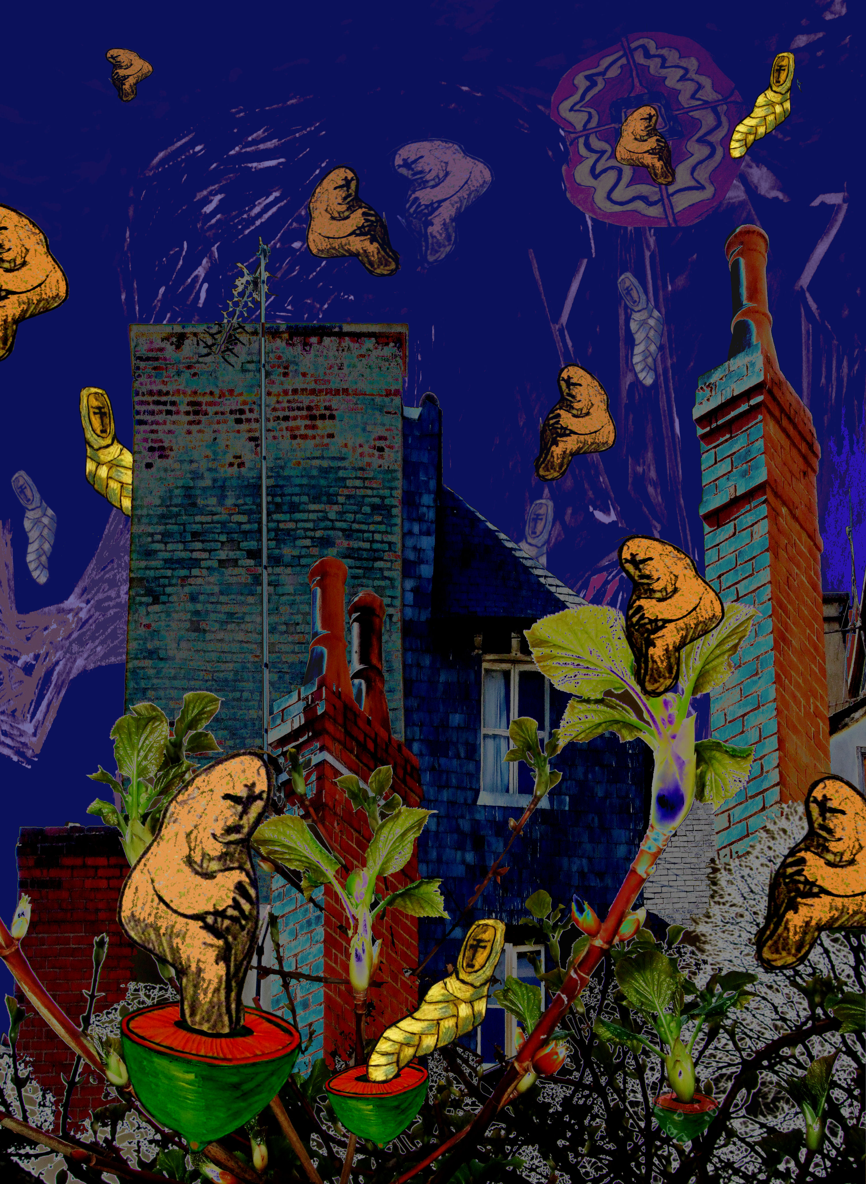 "Thursdaynight roofscape in Rennes somewhere back in 2008 " " " is een digigrafiek, een digitale combinate van dakschappen in Rennes en fragmenten uit mijn tekeningen. Geprint op Hahnemülle Fine Art Paper (310 grams geschept papier). Beeld formaat standaard ongeveer 37x 50 cm maar andere formaten zijn in overleg mogelijk. Maximum oplage:10