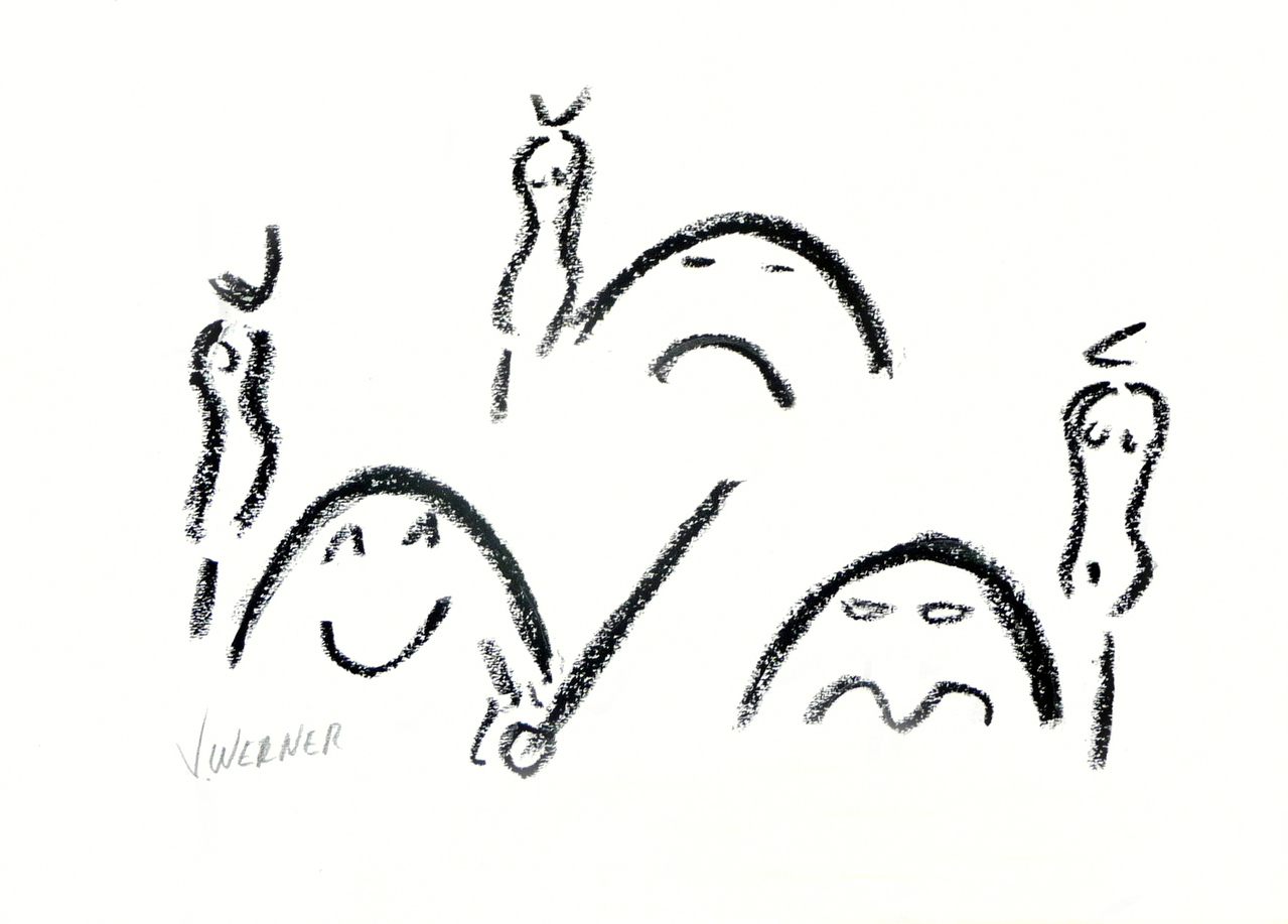 Bij mijn tekeningen in krijt op papier gaat het me vooral om lijnen, streepjes, vormen en figuren. Ook staan er nog vroegere litho's geplaatst. Alle werken zitten in een eenvoudige lijst. Mijn tekeningen op papier zijn zonder of mèt lijst te koop.