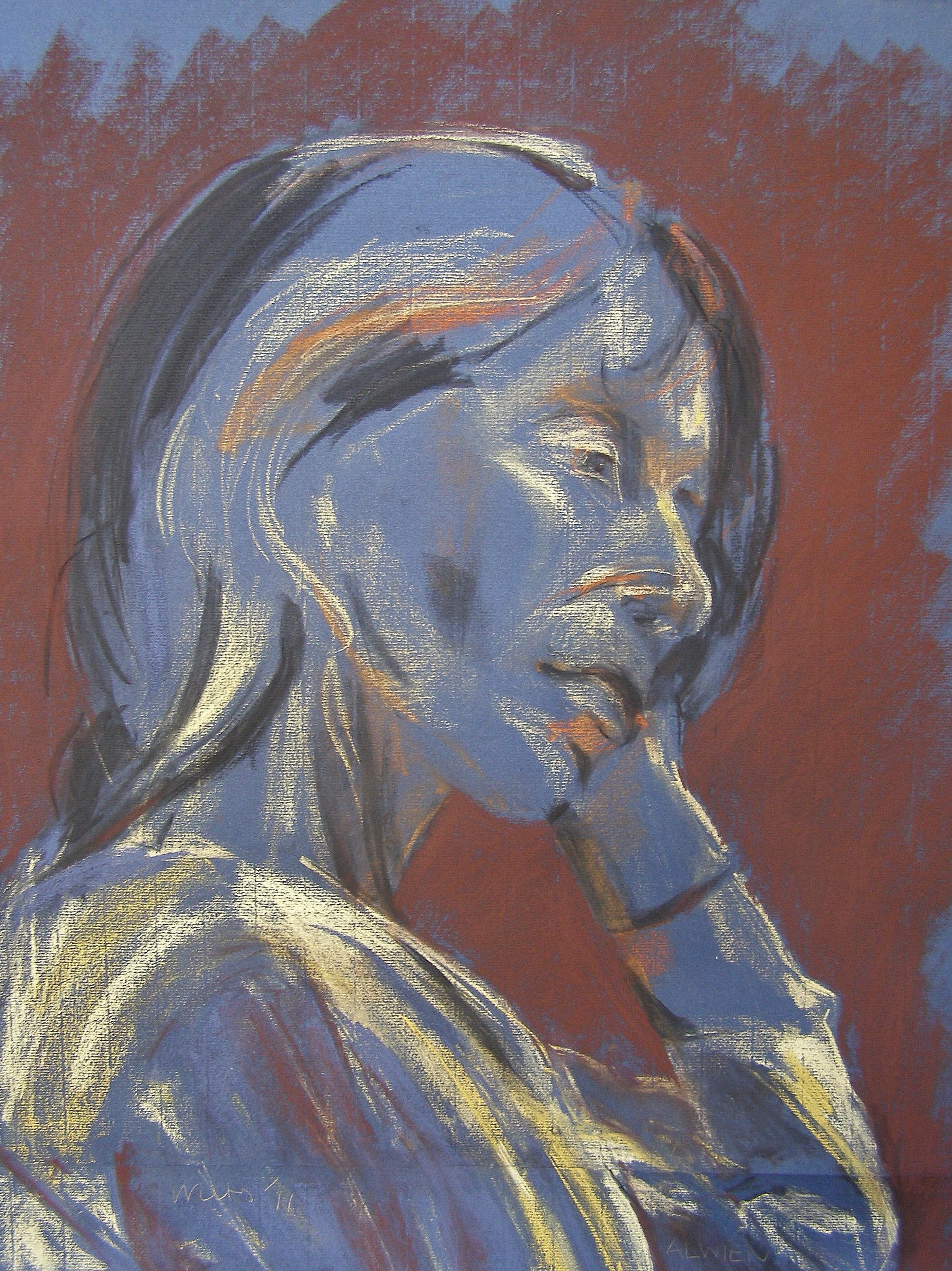 Pastelkrijttekening naar waarneming, op ingrespapier.