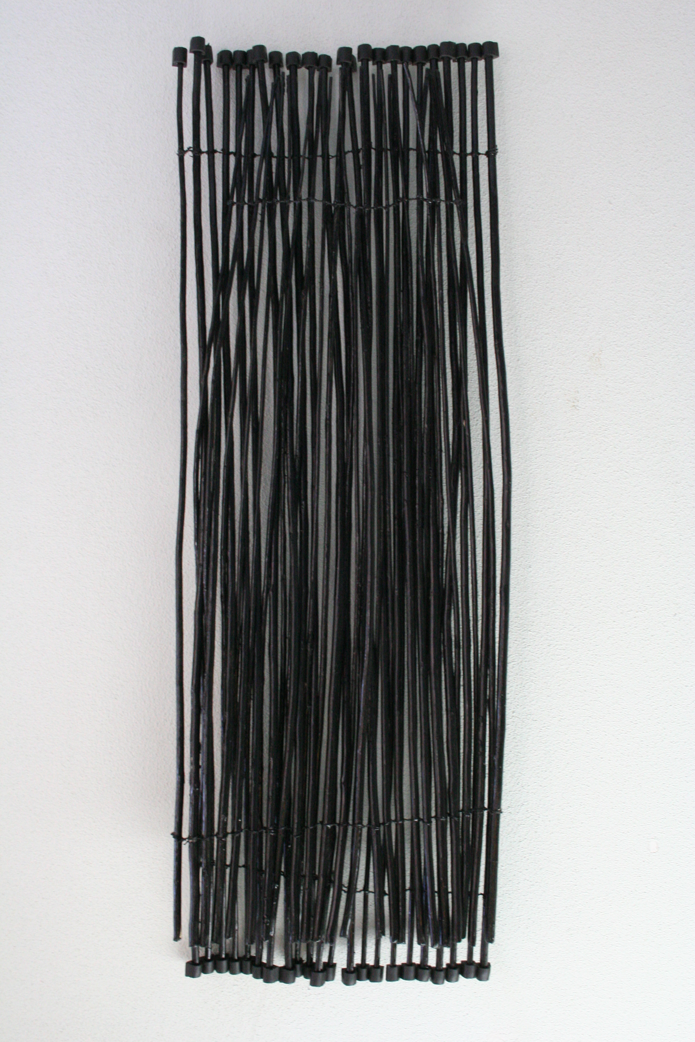 Het scherm hangt aan de muur Materialen: houten stokjes, rubber, draad