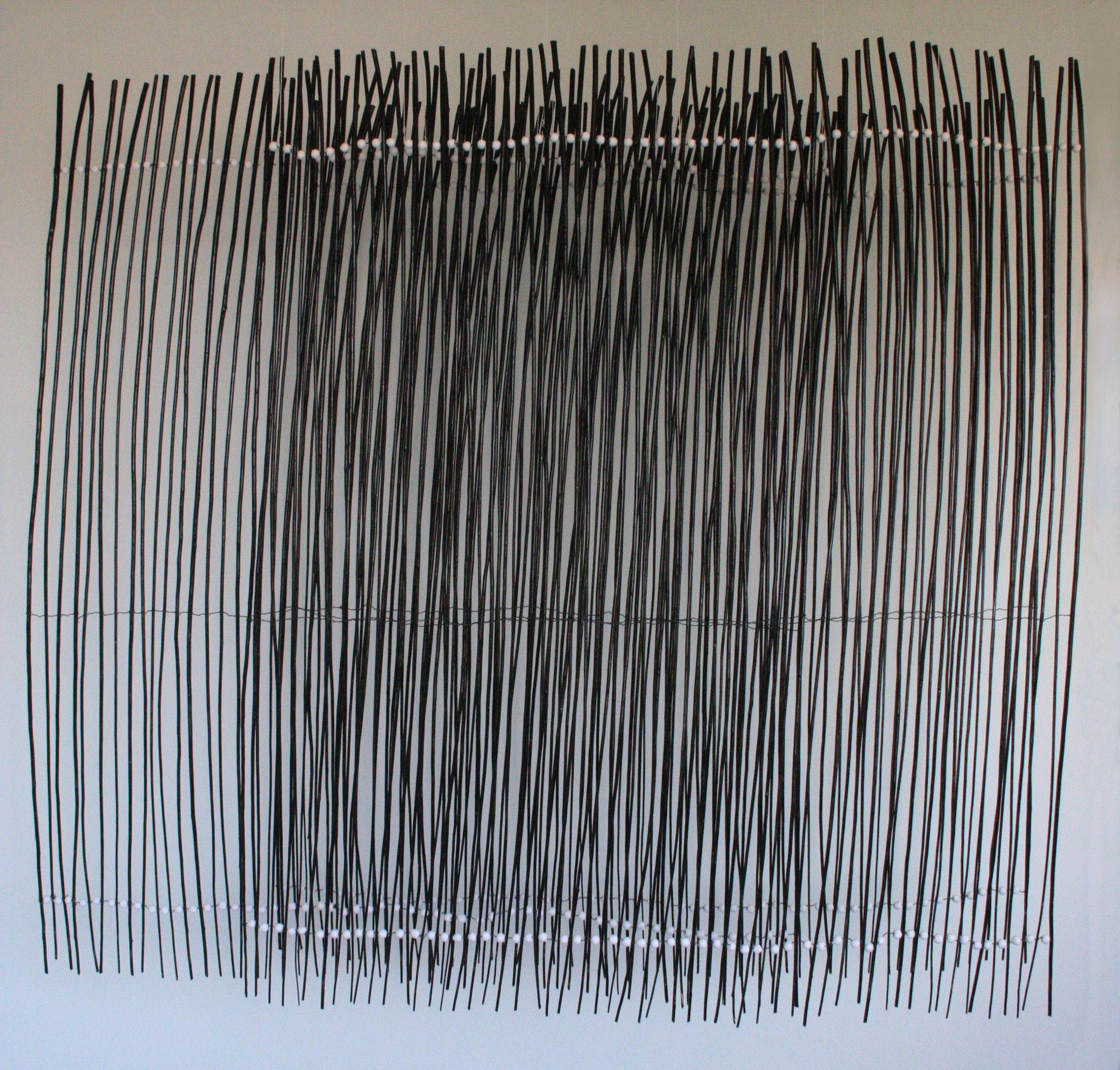 Het scherm hangt met draden aan het plafond Materialen: houten stokjes, watten, draad