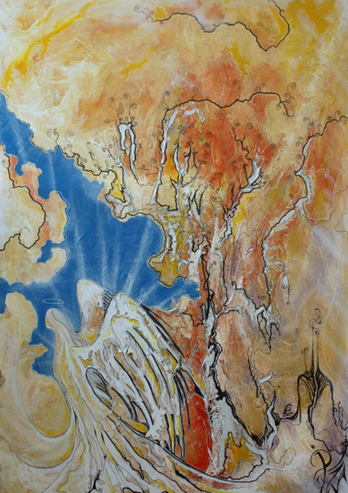 Zoek de verbogen engel. Veel geel en oker, airbrush en acryl.