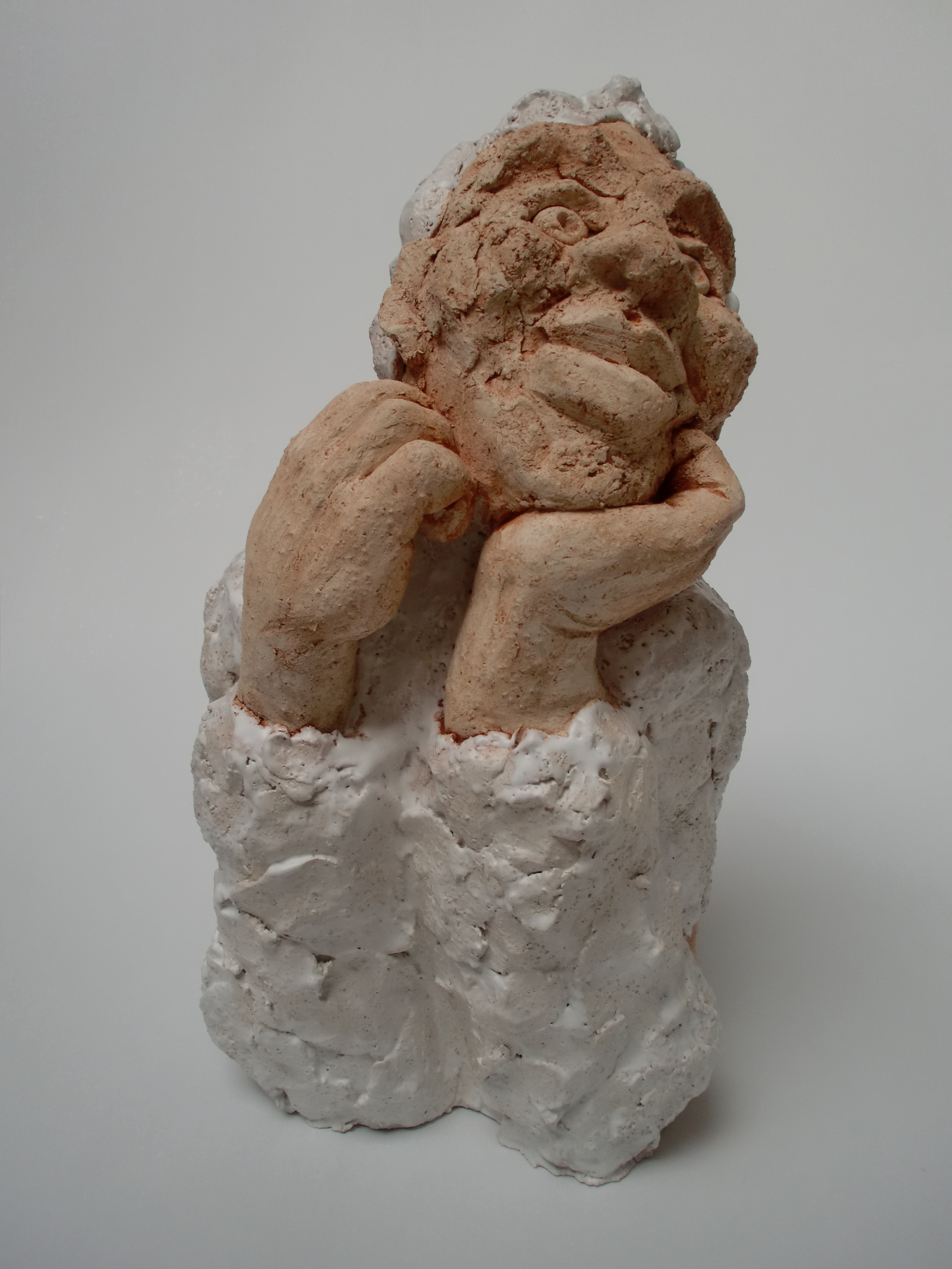 Nadenkende man, buste in keramiek, afgewerkt met wiite matte glazuur