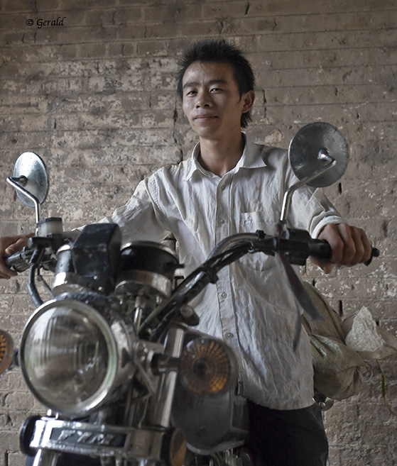 Chinese boerenzoon op motorfiets, omgeving Yuangshou.