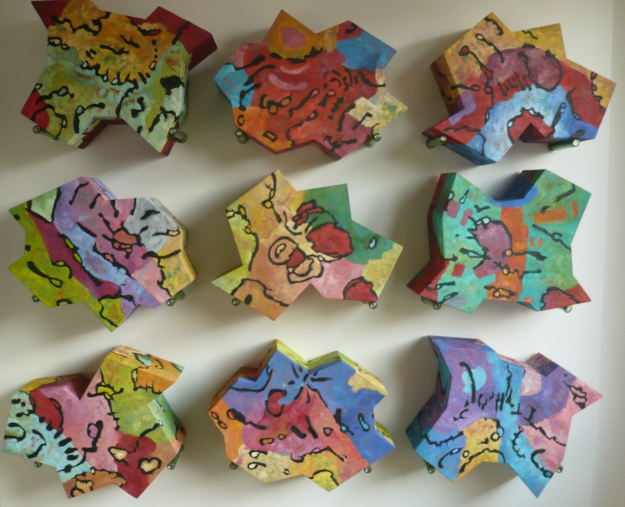 Abstracte schilderijen en dito beschilderde objecten in een stijl die ligt tussen geraffineerde eenvoud en georganiseerde chaos