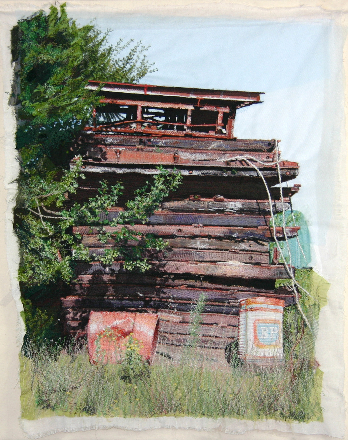 Adinka Tellegen maakt doeken die ‘geschilderd’ zijn op de naaimachine. Er komt geen pen, geen potlood en geen penseel aan te pas, alleen stukjes textiel en machinegaren. Dat is pas van dichtbij te zien.