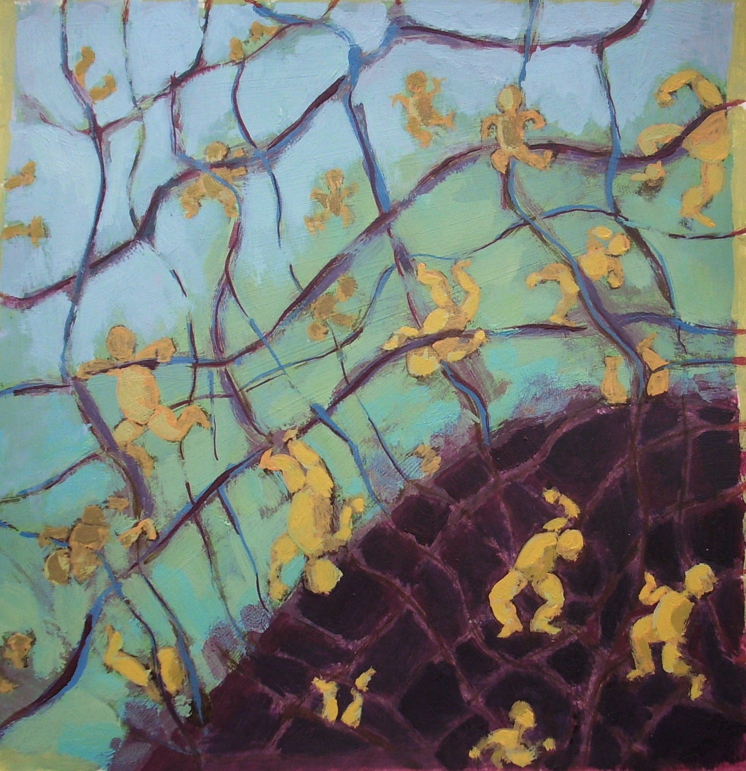 Een van vier kleine werkjes. Onderdeel van de serie "vrije val" Hoe en waar komen we ter wereld.