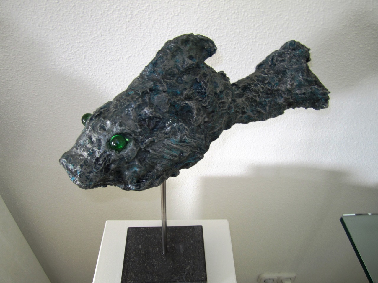 Vis met groene ogen,draaibaar in verschillende posities. Totale hoogte met sokkel 45 cm