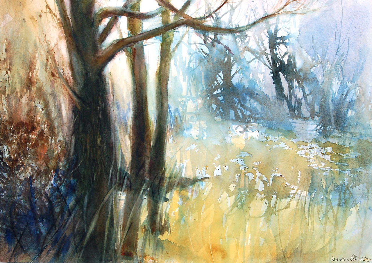 naakte bomen in een vochtig bos; aquarel in passe-partout