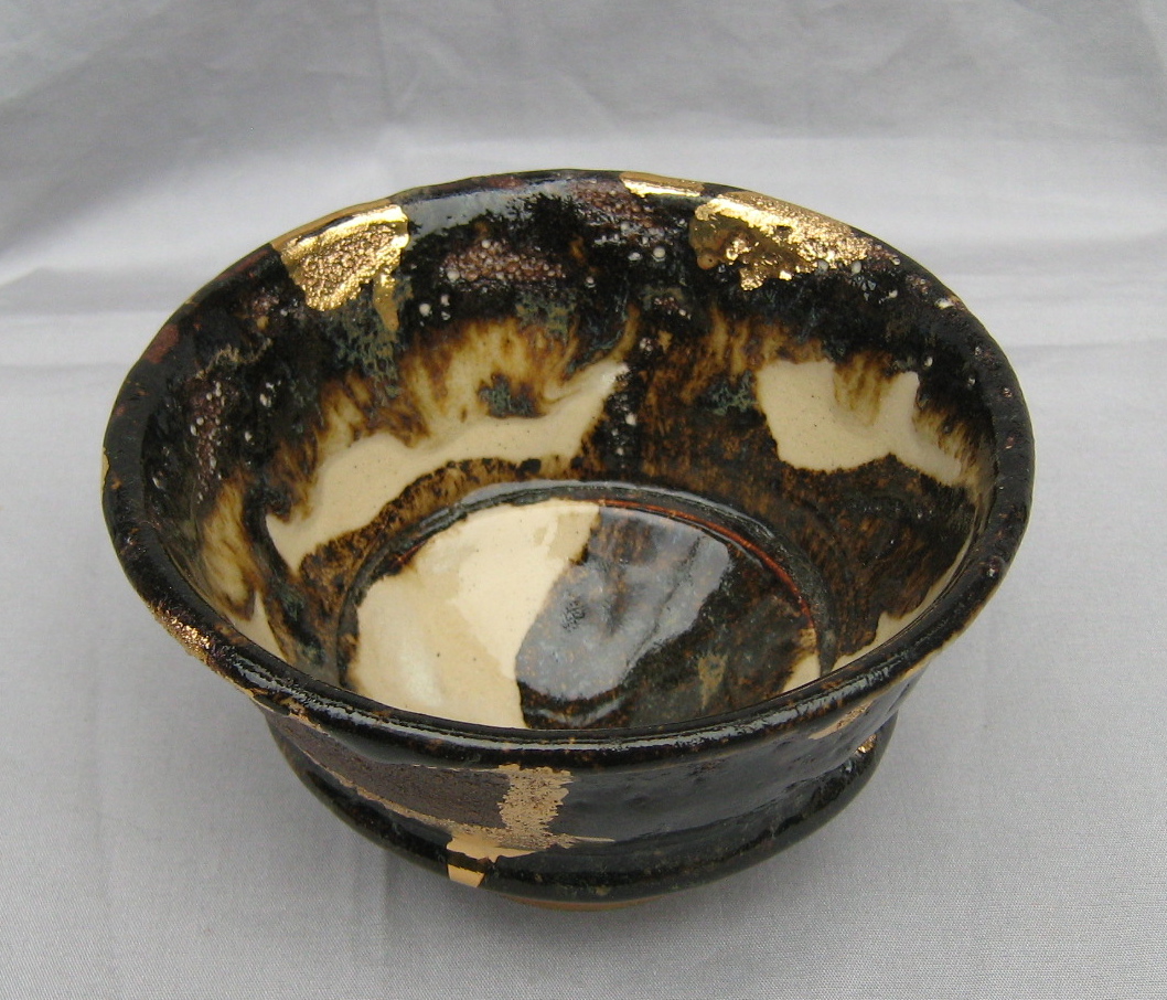 ZomerTheekom STEENGOEDKLEI Porseleinslib / Tenmoku ijzerglazuur / transparante glazuur / goudluster / 3 x gestookt