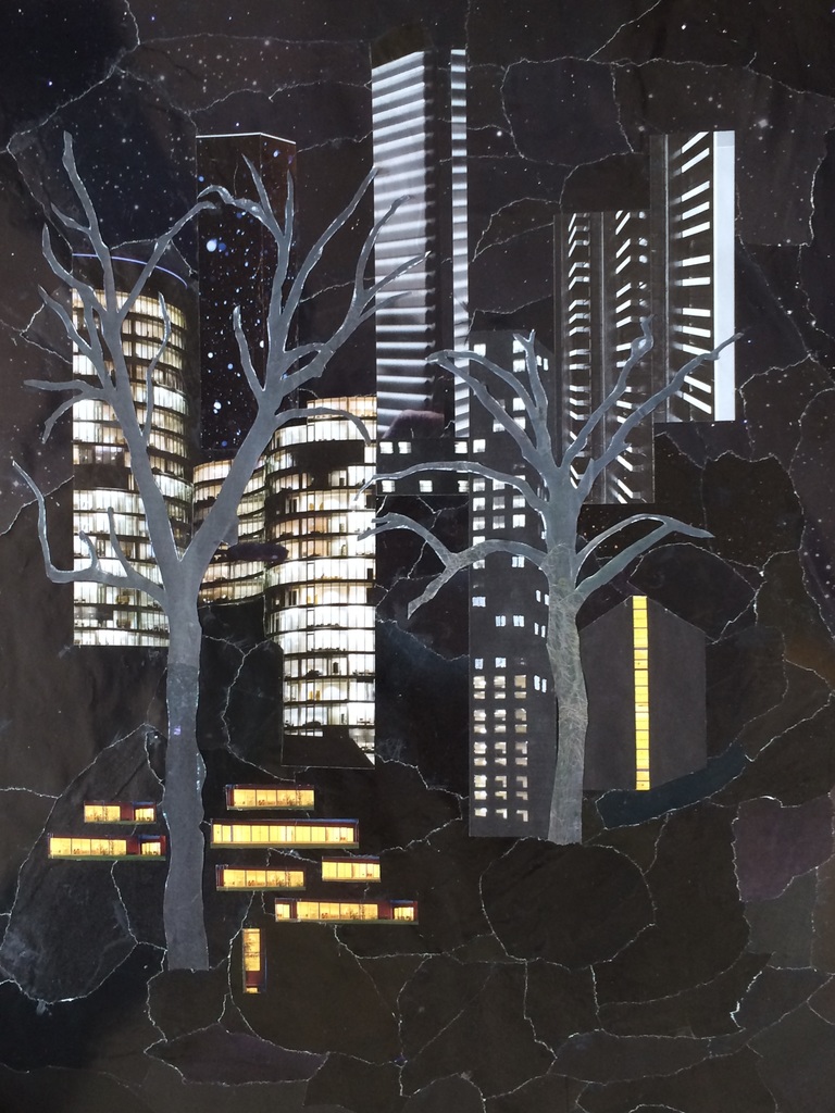 Wit Geel Zwart Yellow Bomen Black Collage White Gebouwen Sterren Buildings Trees Stars Verlicht Lighted Kerst Christmas