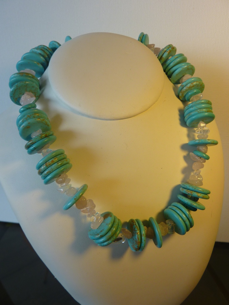 Ketting met edelstenen; onder andere turquois (1,8cm), rozenkwarts en bergkristal op gecoat staaldraad. Lengte: 46 cm. Incl. organza cadeauzakje en verzendkosten (er is ook bijpassende armband - 14 euro)
