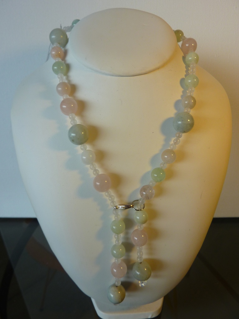 Stropdas-ketting met edelstenen; onder andere aquamarijn en rozenkwarts (kralen tot ca. 1,2cm) op gecoat staaldraad. Lengte: 58 cm. Incl. organza cadeauzakje en verzendkosten