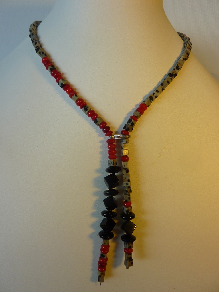 Stropdas-ketting met edelstenen; onder andere agaat, onyx en bloedkoraal (kralen tot ca. 0.7cm) op gecoat staaldraad. Lengte: 62 cm. Incl. organza cadeauzakje en verzendkosten