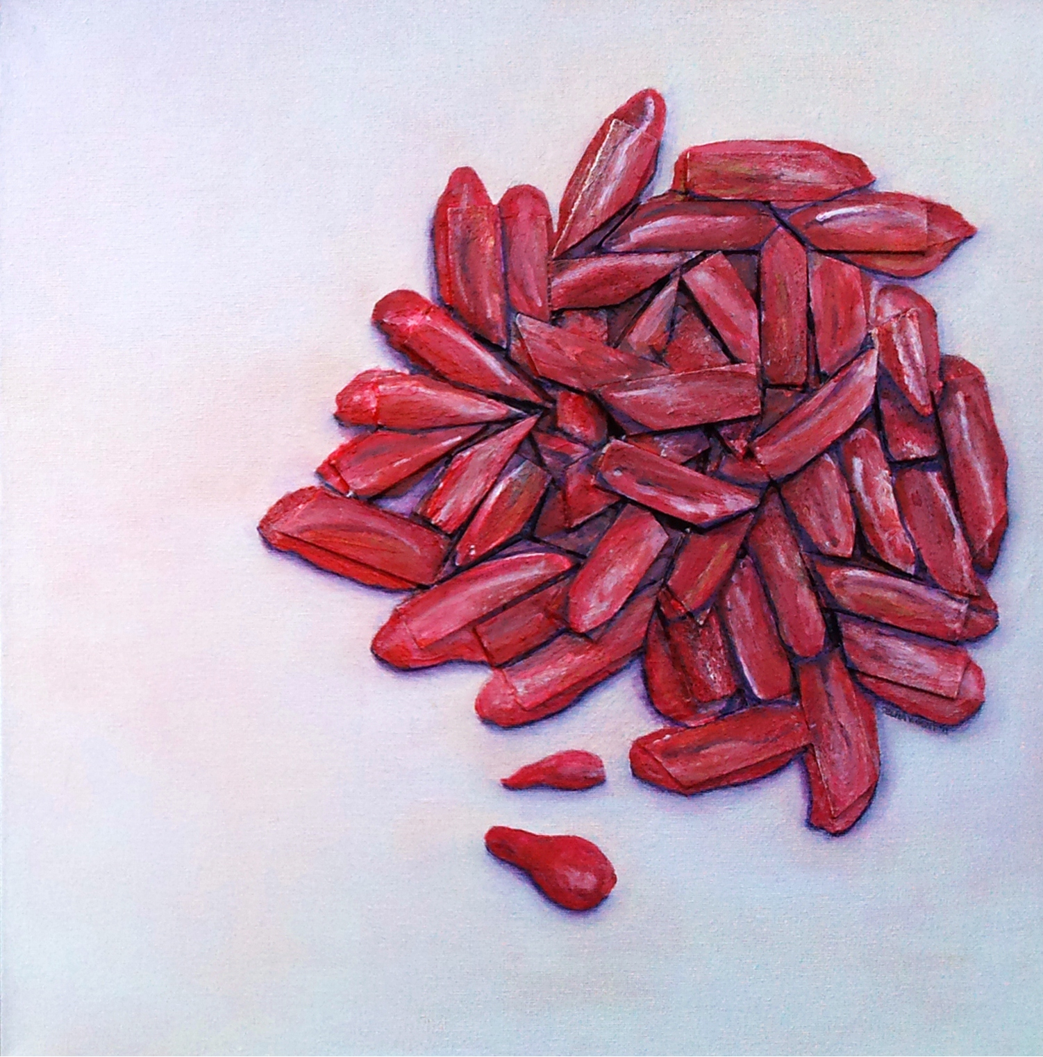 Roze gedroogde bloem blaadjes op een hoop. Gemaakt met opgestapelde houtjes(3-d). Onderdeel van twee-luik (zie paarse gedroogde bloemblaadjes)