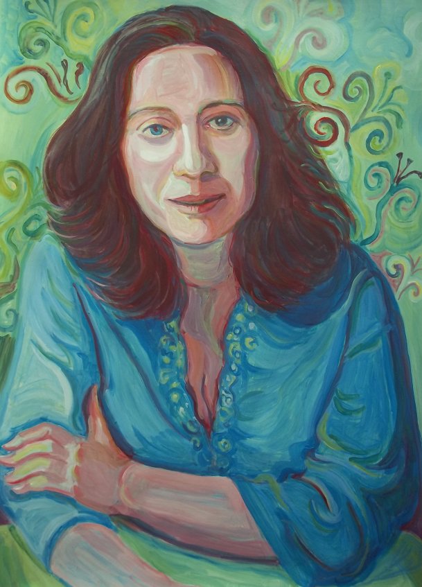Een vrouw gekleed in turkooise bloes met symbolisch lelies.