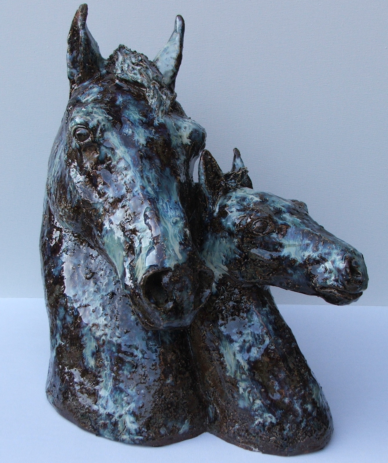 Beeld van de hoofden van een merrie met veulen, met een speciale effectglazuur.