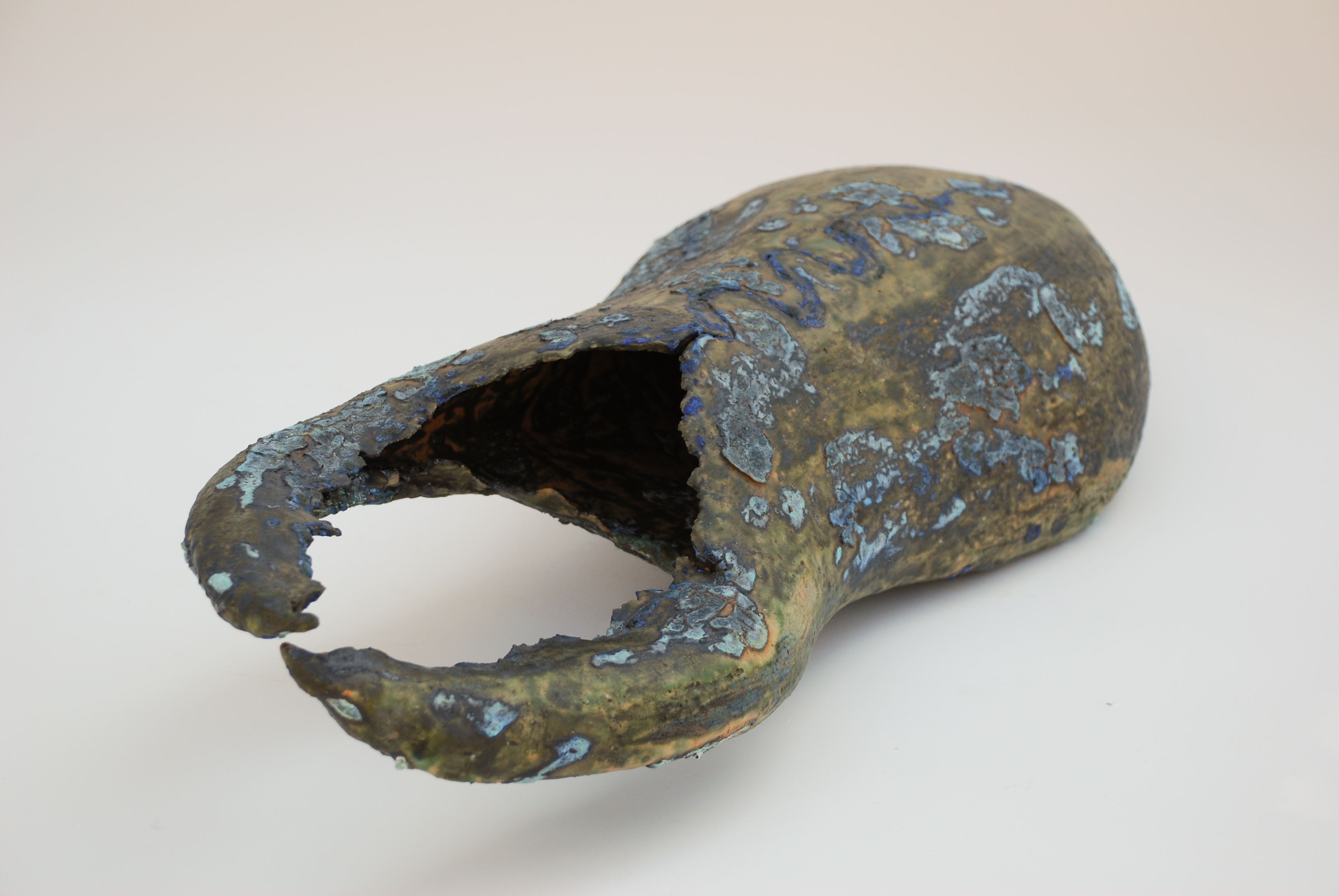 Naar aanleiding van een meanderende rivier kwam het beeld van deze vorm in mijn hoofd op. Oorspronkelijk was het de bedoeling dat hij ronder en anders van kleur zou worden. Maar zoals wel vaker veranderde de vorm tijdens het maken. Aardewerk, glazuur.