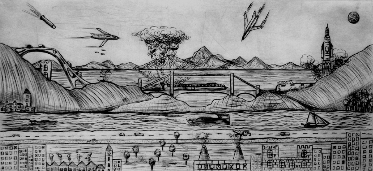 Water Bergen Bomen Grafiek Oorlog Huisjes Ets Raket Panorama Zeilboot Schoorsteen Treinen Alledaags Drogenaald