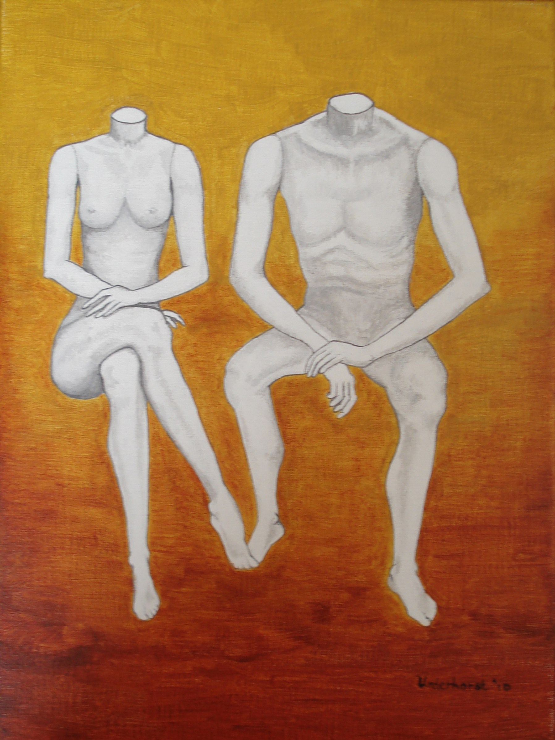 KOPP: Dit schilderij ontstond toen ik een flyer ontwierp over KOPP. Toen het logo klaar was heb ik het geschilderd. De twee figuren stellen ouders voor die psychische klachten hebben. De figuren hebben geen hoofd: wat symbool staat voor het 'er-met-hun-hoofd-niet-helemaal-bij-zijn', ook al zouden ze dat wel willen, waar het opvoeden betreft. De witte lijven staan symbool voor de kilte van het emotioneel niet beschikbaar kunnen zijn op momenten dat dat voor een kind nodig is. Het naakt zijn staat voor de kwetsbaarheid. Toch zien ze er verder redelijk 'normaal' uit: de buitenwereld weet niet altijd wat er achter gesloten deuren gaande is...er rust een taboe op.