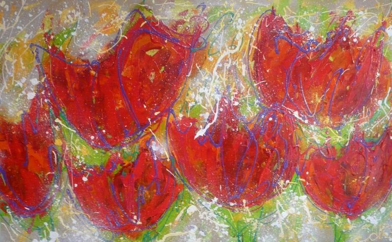 Ik schilder modern abstracte kunst . kunst waar je vrolijk van wordt Ik werk met heel veel acrylverf op doek Het werk is erg kleurrijk. Ik gebruik zoveel acrylverf dat er een 3 d effect ontstaat. Gebruik van warme felle kleuren. Ik lak mijn schilderijen met glans af .thema;s zijn dieren bloemen eten mensen. Humor in mijn werk vind ik erg belangrijk