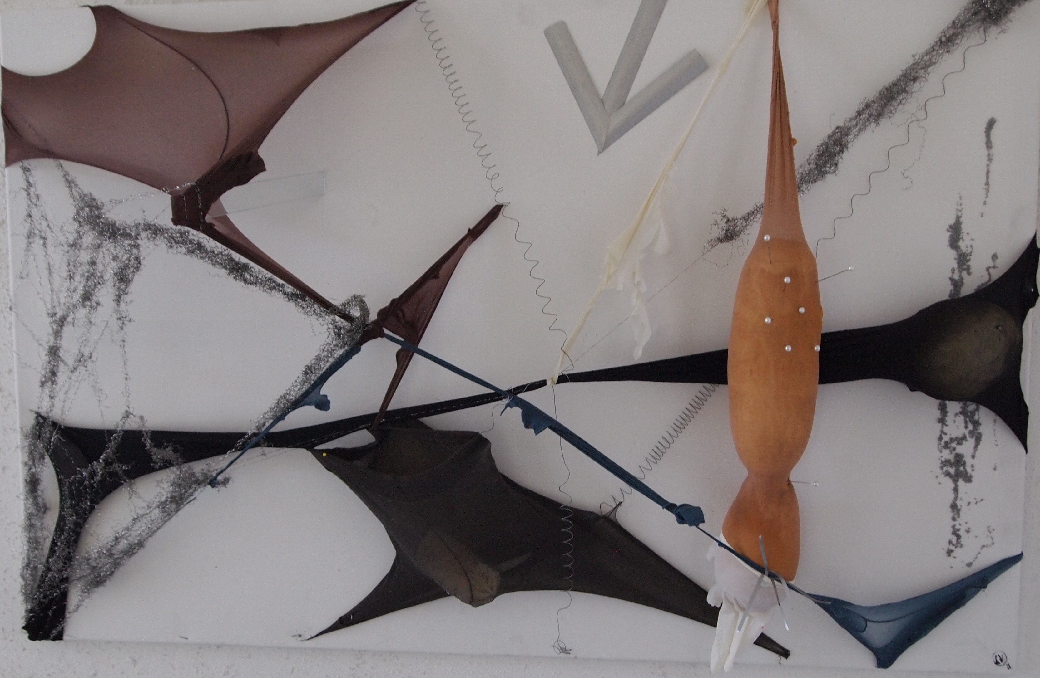 Nylonkousen, condoom, allerlei materialen die een sinistere sfeer oproepen