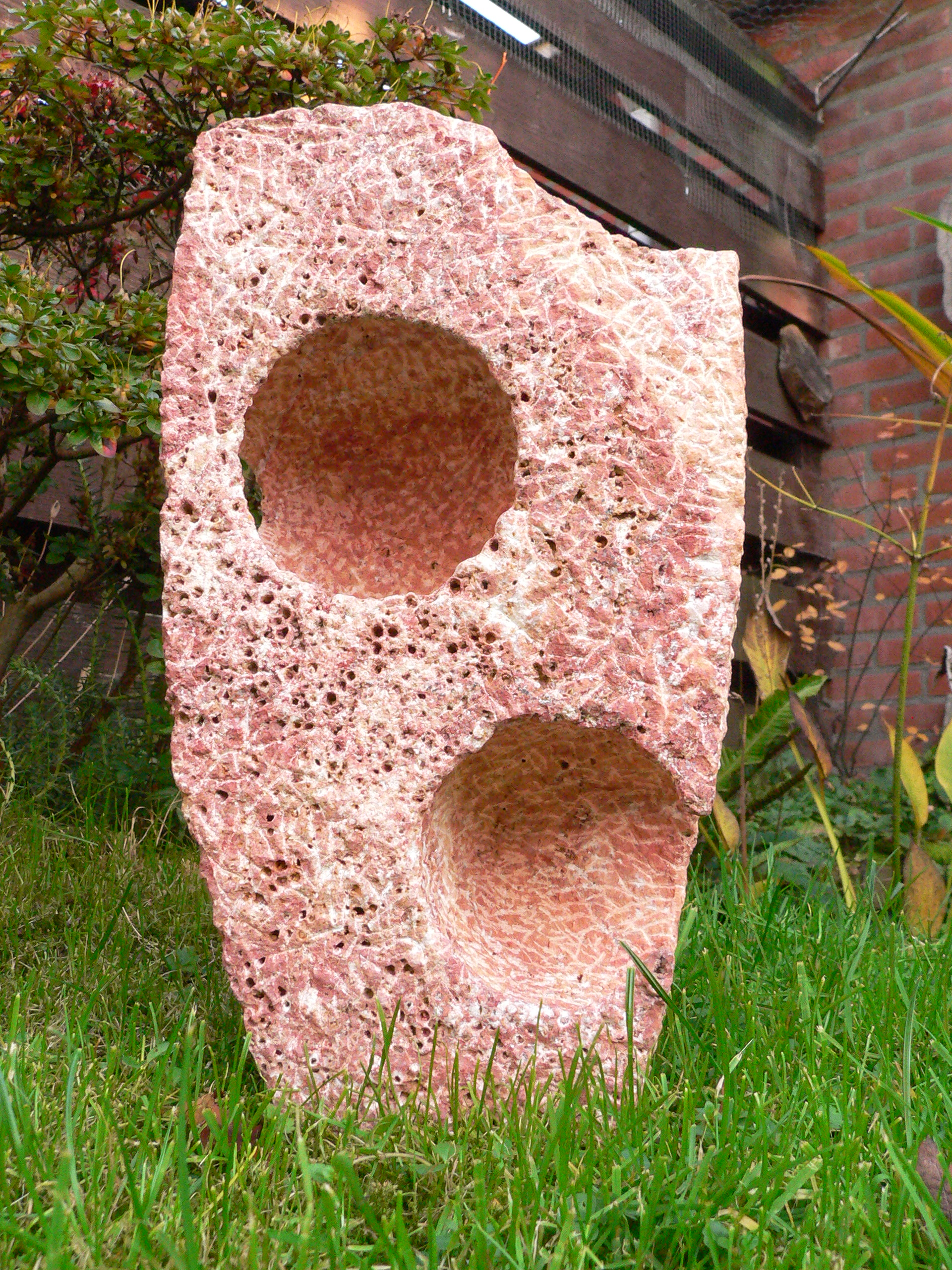 Travertin. Mooi materiaal om mee te werken. Het voornemen om de steen met een kleine widia puntbeiteltje te bewerken heb ik uitgevoerd. De vorm van de steen bracht vlakken met zich mee. Ik bedacht me hoe het zou zijn als ik een 2-tal "ballen" in de steen zou kunnen duwen en die zou kunnen visualiseren. Achteraf kan ik concluderen dat ik het vervaardigen van dit werk uitdagender, (alleen werken met een puntbeiteltje) en interessanter, vind dan het eindresultaat. Ben nog op zoek naar een stevige sokkel, dat heeft echter geen haast.
