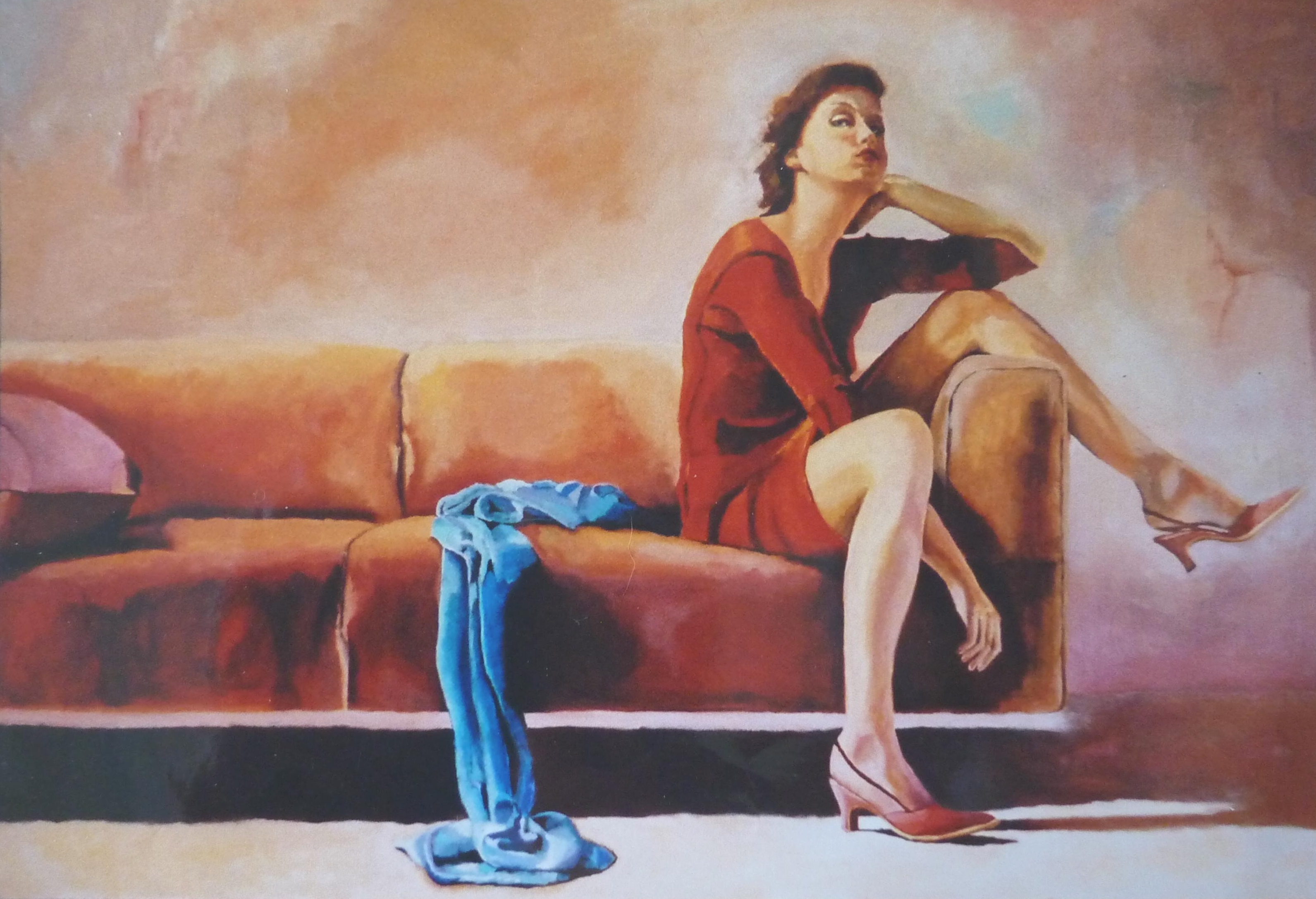 Hedendaags Realistich Figuratief Jonge Vrouw Bank Zittend Pose Interieur Hakken