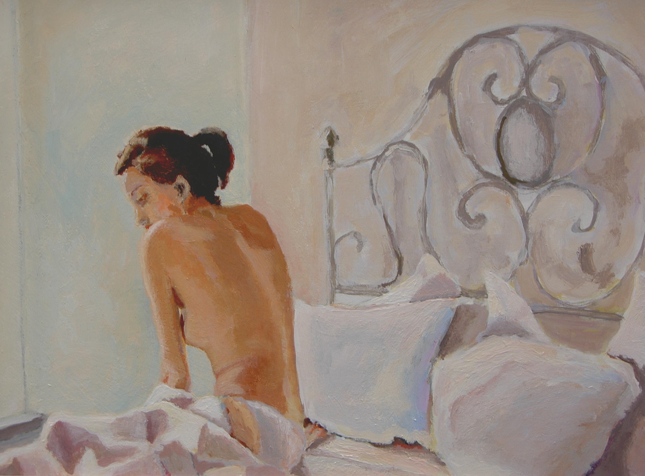 Acryl Vrouw Paneel Jonge Rug Bed Zittend Halfnaakt