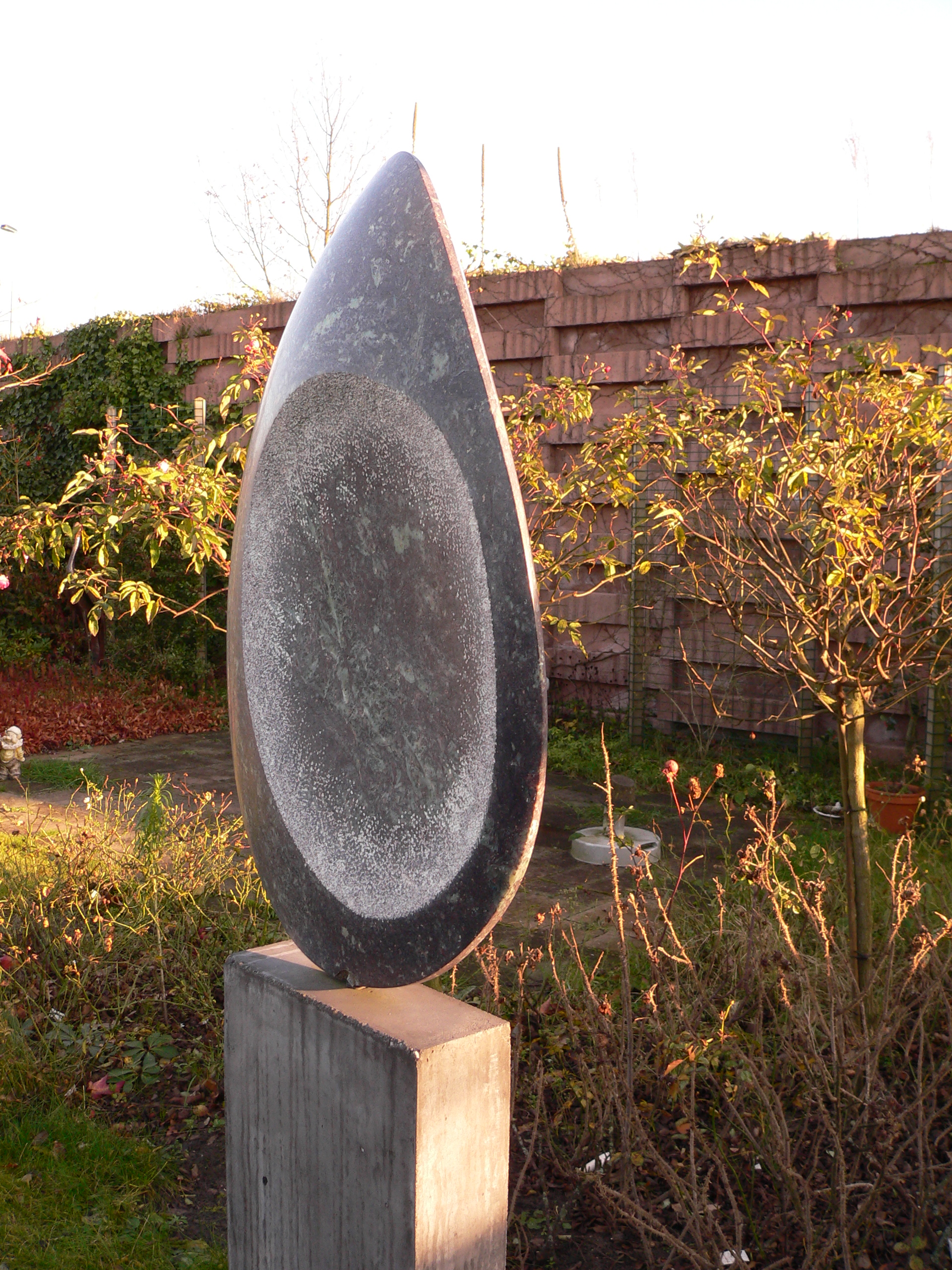 Dit werk is van serpentijn gemaakt. Het staat op een zwarte, betonnen sokkel. Het liefst zou ik hebben gehad dat dit werk horizontaal in de ruimte zou zweven.