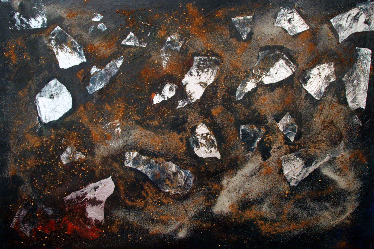 Onweer, in de Sahara woestijn. Acryl, aluminiumfolie, griesmeel en grove paprika poeder.