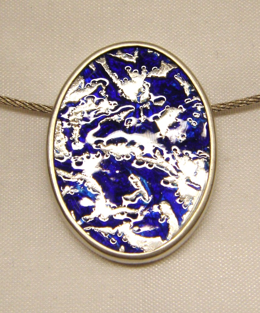 Blauw geëmailleerde zilveren hanger in mat zilveren kast, aan edelstalen collier.