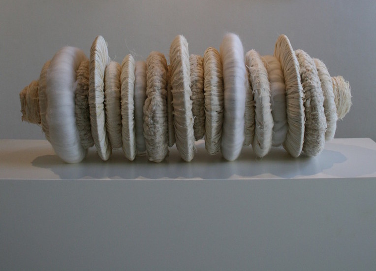 Object van 20 ringen omwikkeld met div natuurlijke materialen, wol, katoen, raffia. In verhuur trouwzaal Gemeente Alphen aan den Rijn