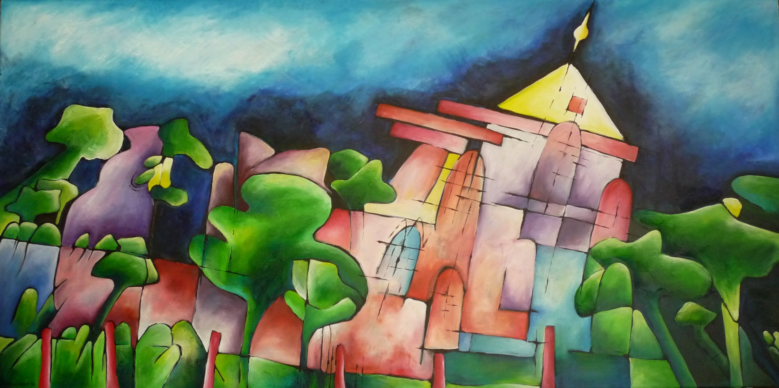 Kasteel Montfort in figuratieve abstractie en in heldere kleuren.