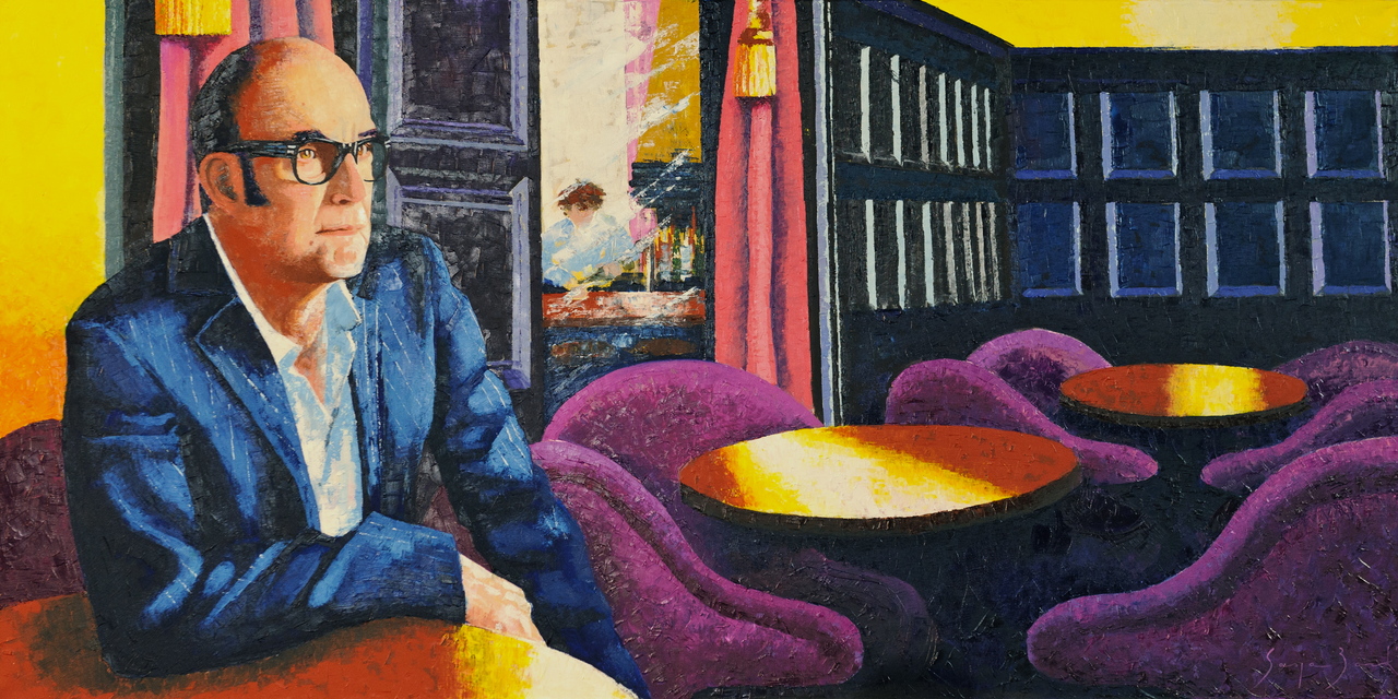 In 2012 schilderde ik Bart Chabot voor het tv programma Sterren op het Doek. Een mooie ervaring, vooral ook omdat zijn keuze op mijn portret viel. Voor de achtergrond gebruikte ik het interieur van het Haagse Hotel Des Indes. Helemaal met paletmes gemaakt in de stijl van de serie 'Taferelen' in 2012.