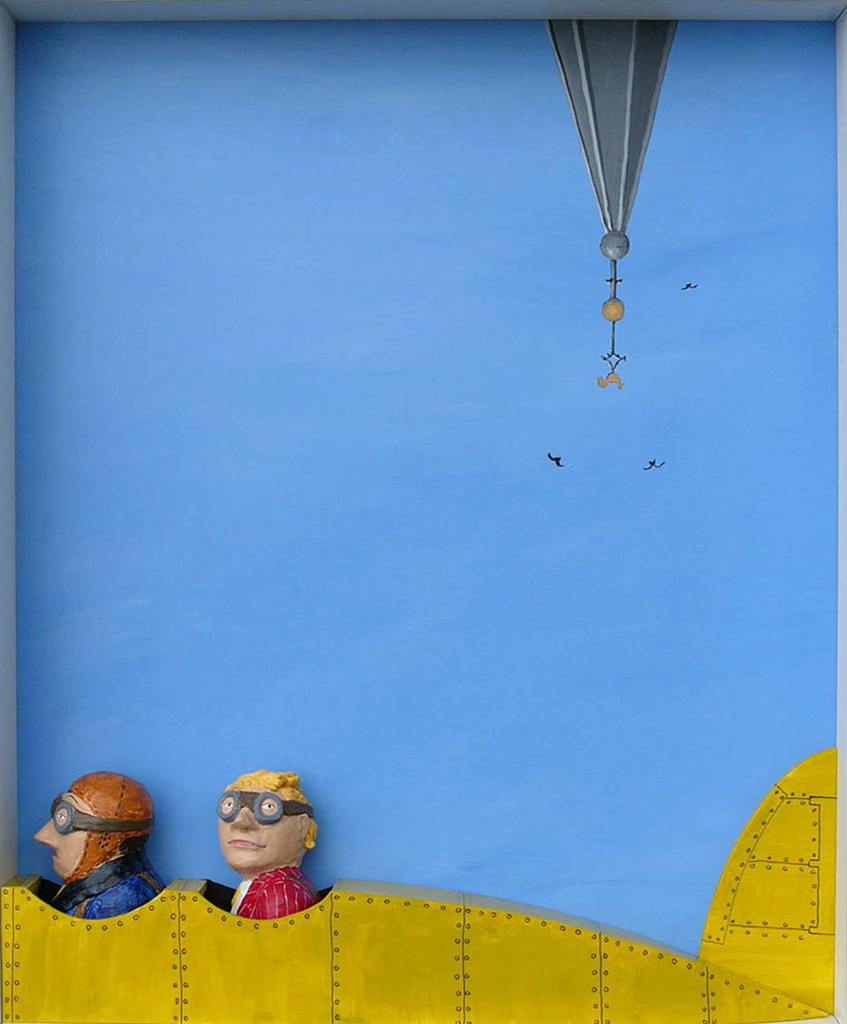 Schilderij twee-en eenhalf dimensionaal uitgevoerd. Achetrgrond paneel met acrylverf. Voorgrond gips en foamboard met acrylverf.