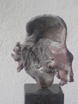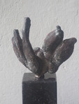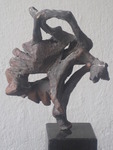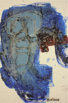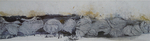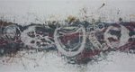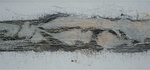 gemengde techniek op linnen, in baklijst. Rafelrand linnen is kenmerkend onderdeel van het werk