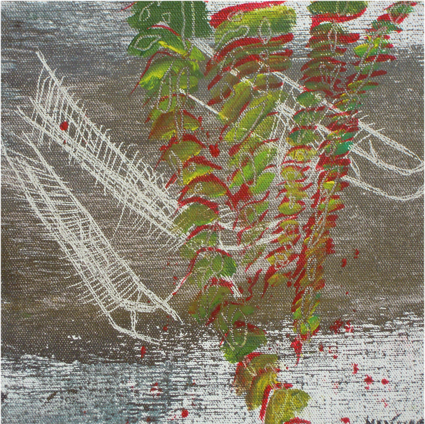 gemengde techniek op linnen, in baklijst. Rafelrand linnen is kenmerkend onderdeel van het werk