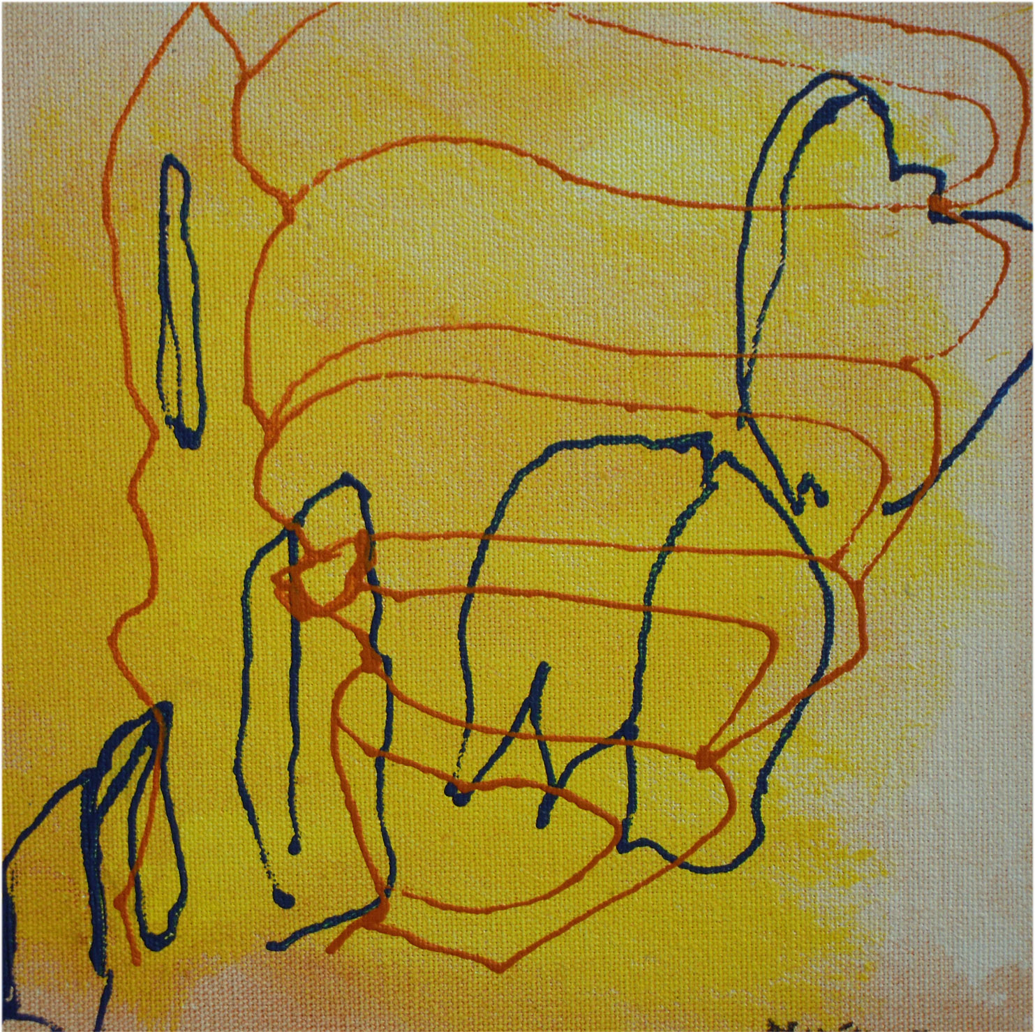 gemengde techniek op linnen, in baklijst. Rafelrand linnen is kenmerkend onderdeel van het werk