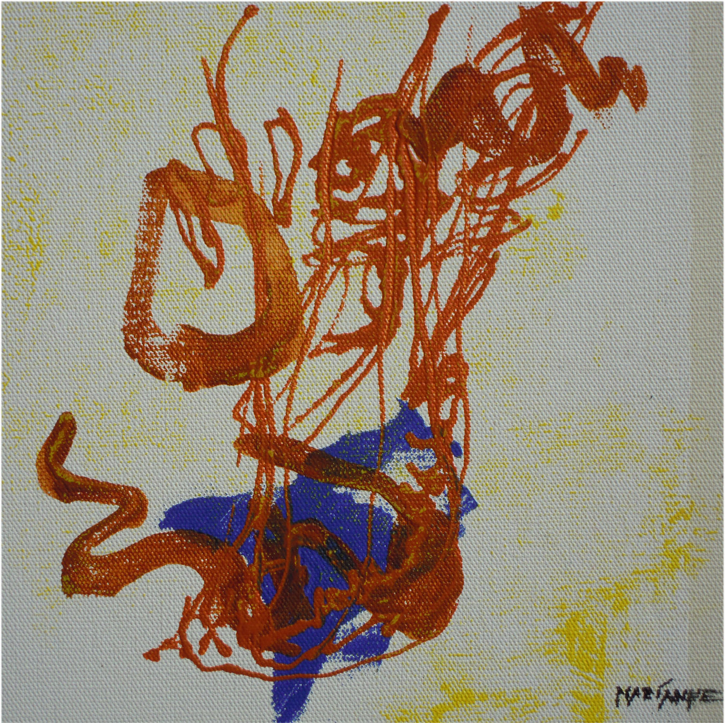 gemengde techniek op linnen, in baklijst. Rafelrand linnen is kenmerkend onderdeel van het werk