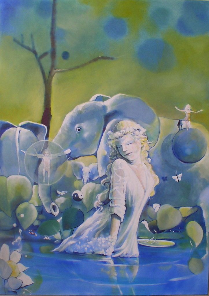Vrouw Olifant Water Slang Bladeren Gekleed Boom Kinderen Speels Yang Lelie Eendjes Yin Kale Lingerie Bellen Waterhoen