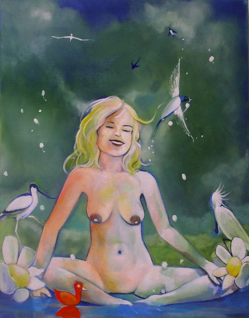 Vrouw Zittend Naakt Genietend Water Lelies Zwaluwen Mug Lepelaar Kluut Opspattend Badeend Geel Wit Blauw