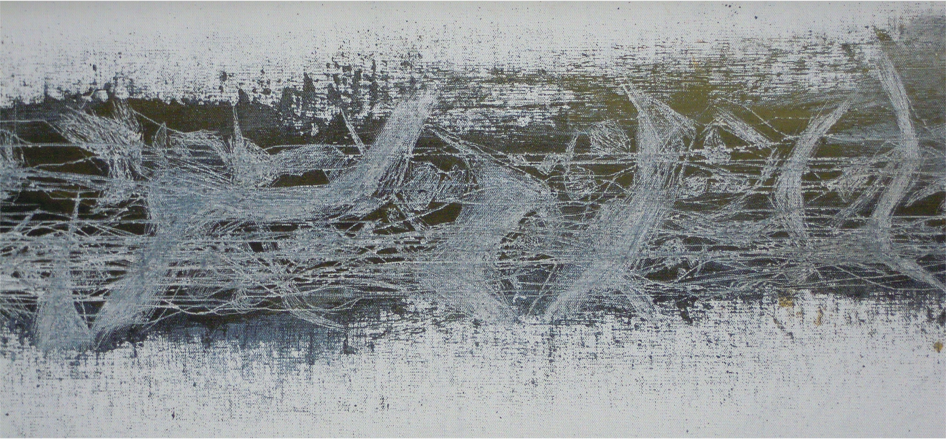 gemengde techniek op linnen, in baklijst. Rafelrand linnen is kenmerkend onderdeel van het werk.